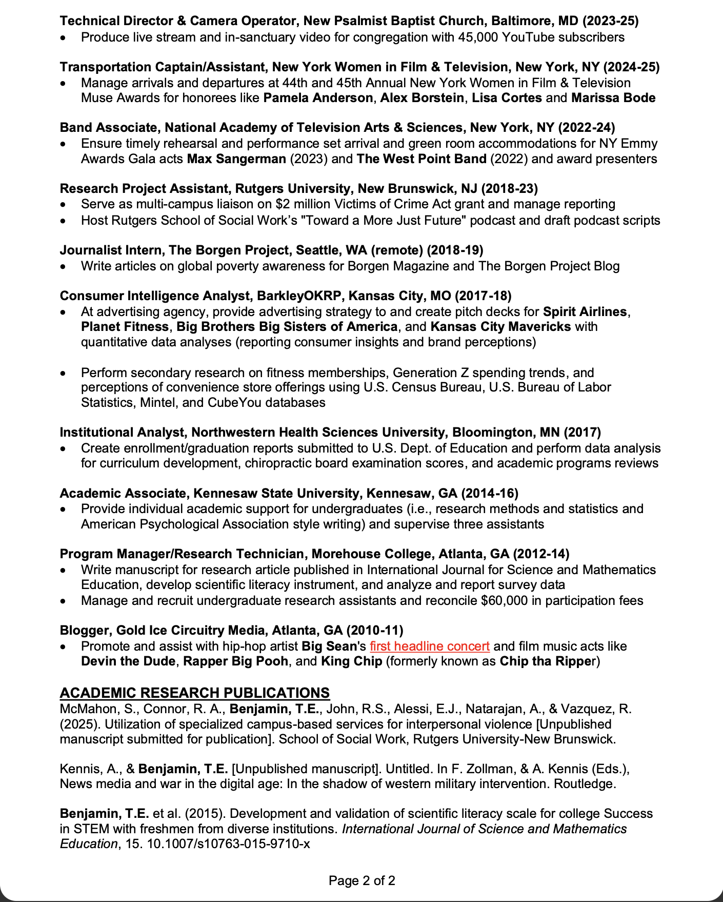 HomeAboutContactEducationExperienceIndustry EventsPlaylistsPodcastsPress Kits and Press ReleasesResearch PublicationsResume & CVVideo ProductionWriting Resume (T. Benjamin) (2026)Download